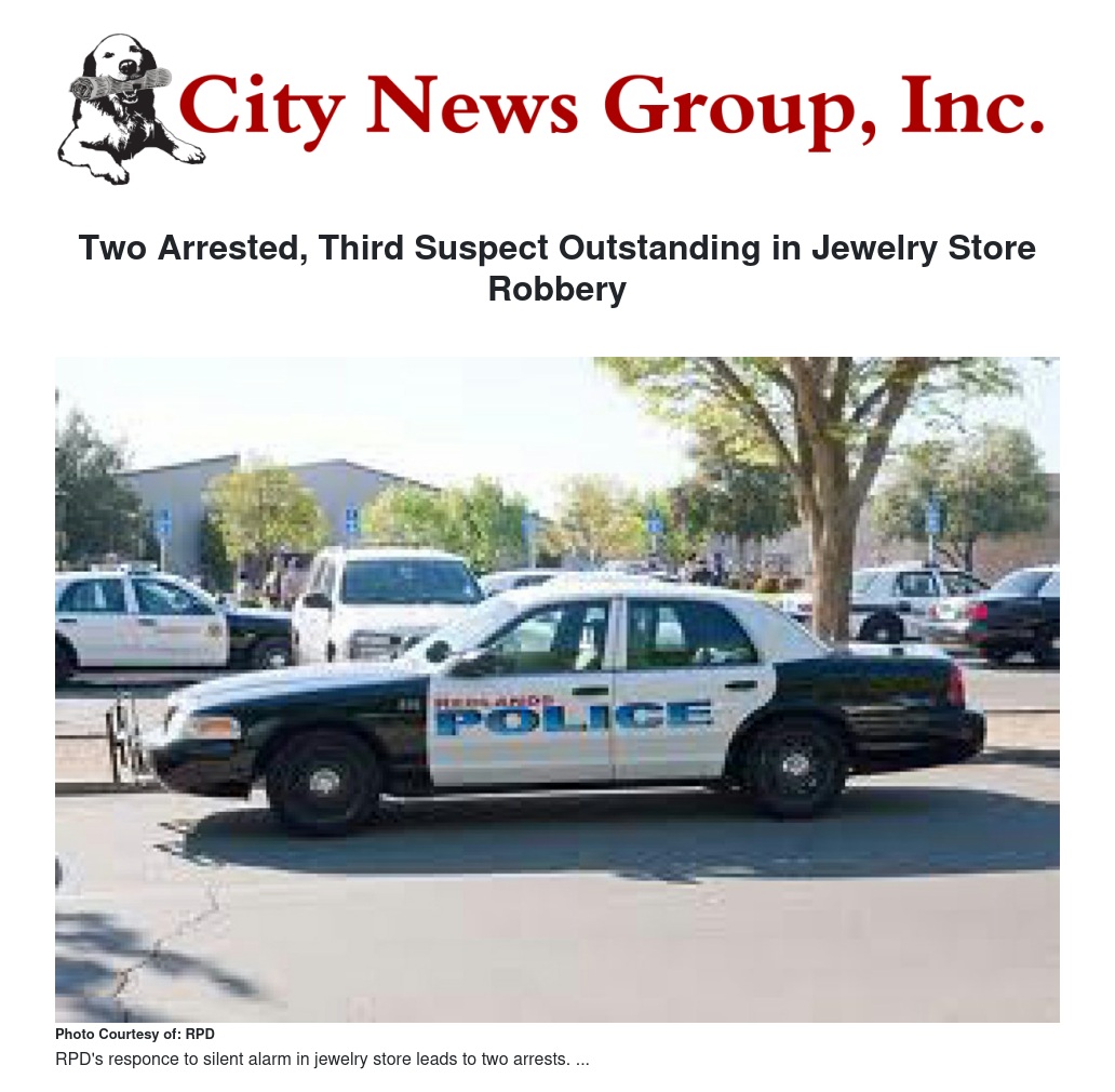 Redlands Police arrested two suspects following an armed robbery at a jewelry store Wednesday. A third suspect is still outstanding.