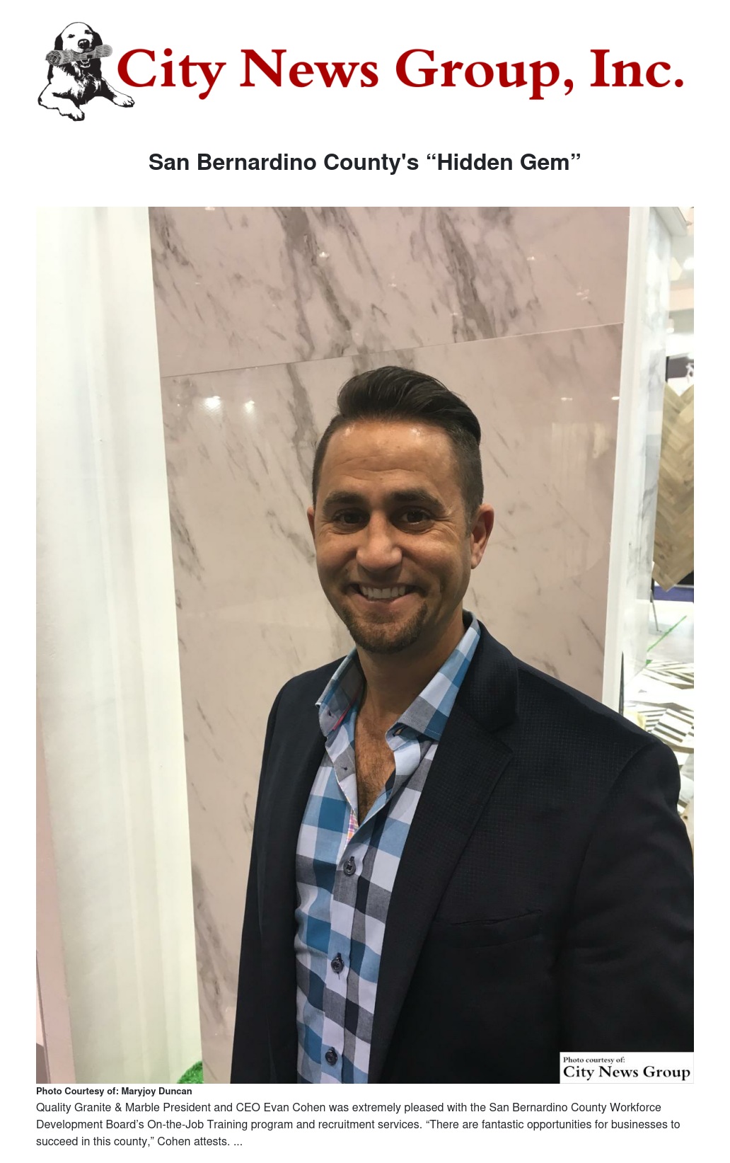 “A hidden gem” is how Evan Cohen, President and CEO of Quality Marble and Granite in Ontario, describes the San Bernardino County Workforce Development Board. Cohen received assistance through the board’s On-the-Job Training and recruitment services.