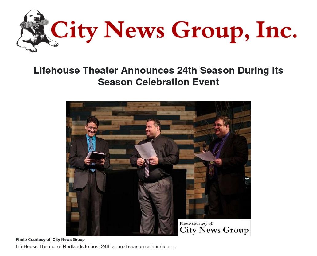 REDLANDS>> LifeHouse Theater of Redlands will host an evening of fun and music, highlighted by the announcement of its 24th theatrical season during its annual Season Celebration. This free event is open to the public and will take place on Sunday, May 7 beginning at 7:00pm at Trinity Church in Redlands.