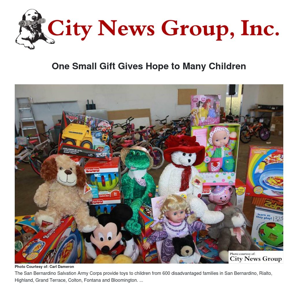 The San Bernardino Corps already has plans to set up two Angel Giving Trees this year, one at Inland Center Mall, and the other at the Wal-Mart store on Hallmark Parkway. Donations received here help The San Bernardino Salvation Army Corps provide toys to children from 600 disadvantaged families in San Bernardino, Rialto, Highland, Grand Terrace, Colton, Fontana and Bloomington.