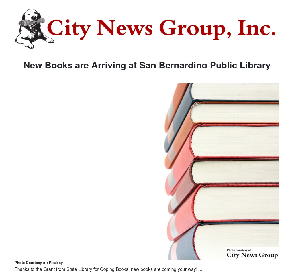 New books have begun to arrive at the four San Bernardino City Libraries from the State Library development grant. These books are covering subjects such as coping, healing, grief, community action, self improvement, empowerment, diversity, tolerance, and multiculturalism. Books are available for adults, young adults, children and Spanish language books.