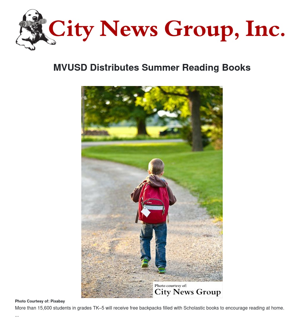 MORENO VALLEY>> Data from the Scholastic Kids & Family Reading Report™ shows that only 48% of parents are aware of the “summer slide” — learning or reading skill loss during the summer months — and that one in five children in lower-income families do not read any books at all over the summer. This summer, Moreno Valley Unified School District helped address these needs by providing 15,600 students in grades Transitional Kindergarten (TK)–5 with take-home book packs customized by Scholastic, the global children’s publishing, education, and media company. The “Spend Your Summer Reading” program, a special book distribution event, was held at Sunnymead Elementary on May 31 at 12 p.m. First-grade students, families and faculty were joined by program initiator Superintendent Dr. Martinrex Kedziora and special guest Clifford the Big Red Dog. Custom backpacks included a set of five free books from Scholastic to take home and keep. The packs also included a letter from the Superintendent Kedziora promoting the importance of summer reading.