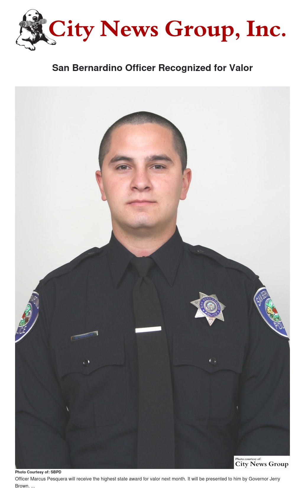 San Bernardino City police officer Marcus Pesquera will receive a medal of valor from Gov. Jerry Brown in a ceremony this month, recognizing the bravery shown by Pesquera in a shoot out last August.