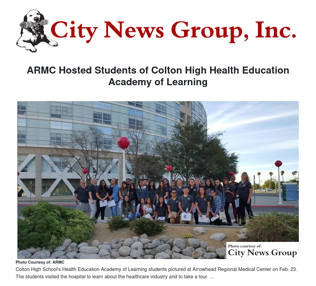 COLTON >> Arrowhead Regional Medical Center (ARMC), in partnership with Reach Out/Inland Coalition, hosted 40 students from Colton High School's Health Education Academy of Learning (HEAL) on Tuesday, Feb. 23. The session included a presentation on the healthcare industry, followed by group breakouts with a discussion of ethics in healthcare settings, interview skills, and a tour of the hospital.