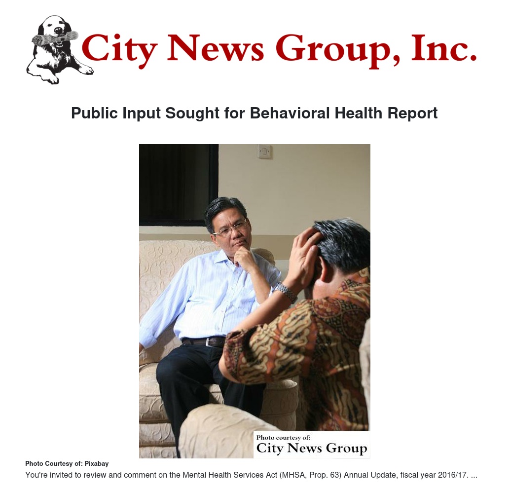 San Bernardino County Department of Behavioral Health (DBH) invites members of the public to review and comment on the draft Mental Health Services Act (MHSA, Prop. 63) Annual Update, fiscal year 2016/17. The Update is a comprehensive report that illustrates the recent progress made by DBH and its contracted partners in addressing the behavioral health needs of the community and addresses proposed changes in MHSA components in the upcoming fiscal year.
