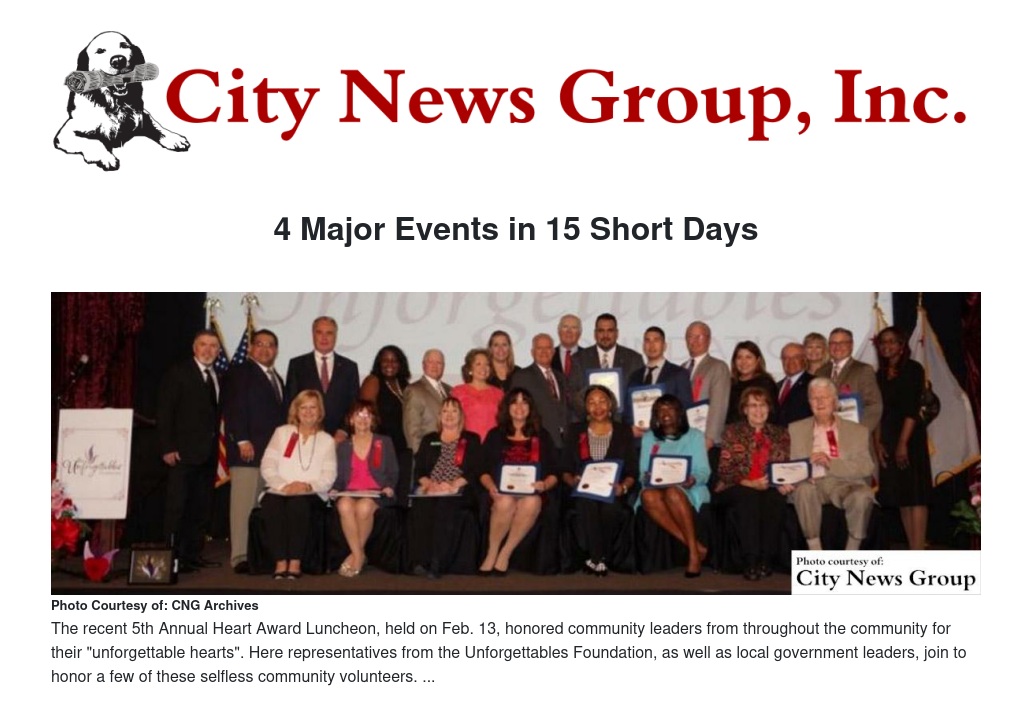Starting with the Unforgettable Night of Laughter with lead comedian Elayne Boosler at the Mission Inn in Riverside on Friday Feb. 5; then the Super Bowl Sunday Golf Tournament at the General Old Golf Course in the Riverside/Moreno Valley area; next the Redlands 5th Annual Unforgettable Hearts Awards of the Inland Empire luncheon with Senator Mike Morrell as the keynote speaker on Feb. 12; followed by the Inaugural Unforgettable Hearts Awards of the High Desert lunch featuring Congressman Paul Cook and Assemblyman Jay Obernolte in Apple Valley where over 750 guests and supporters contributed to and celebrated the TUF mission.