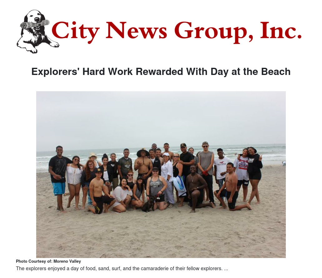 Members of the Moreno Valley Police Department Explorer Post recently enjoyed a day cooling off at the beach as a reward for volunteering nearly 5,600 hours in a variety of assignments and community projects.