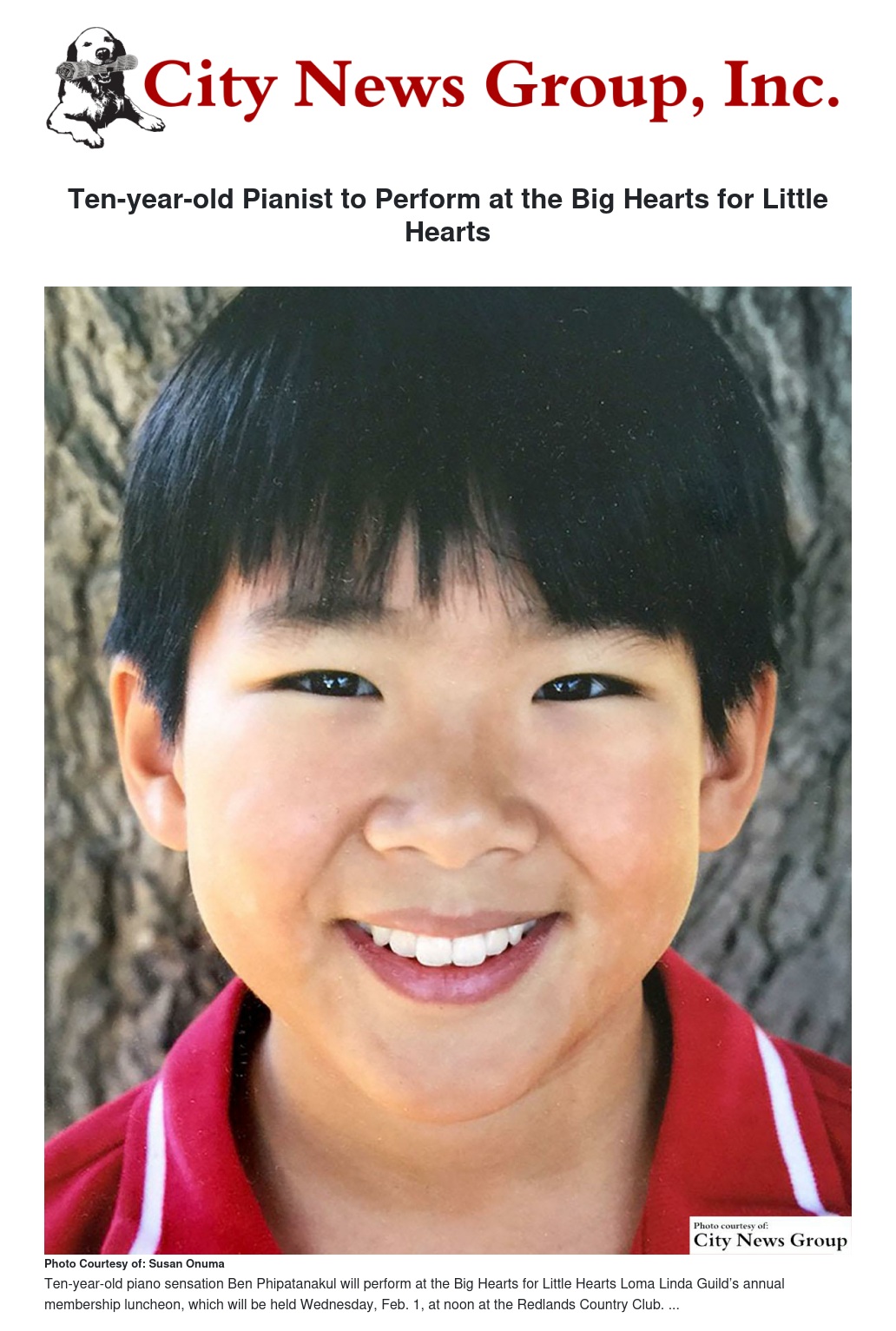 LOMA LINDA>> Ten-year-old piano sensation Ben Phipatanakul will perform at the Big Hearts for Little Hearts Loma Linda Guild’s annual membership luncheon, which will be held Wednesday, Feb. 1, at noon at the Redlands Country Club.