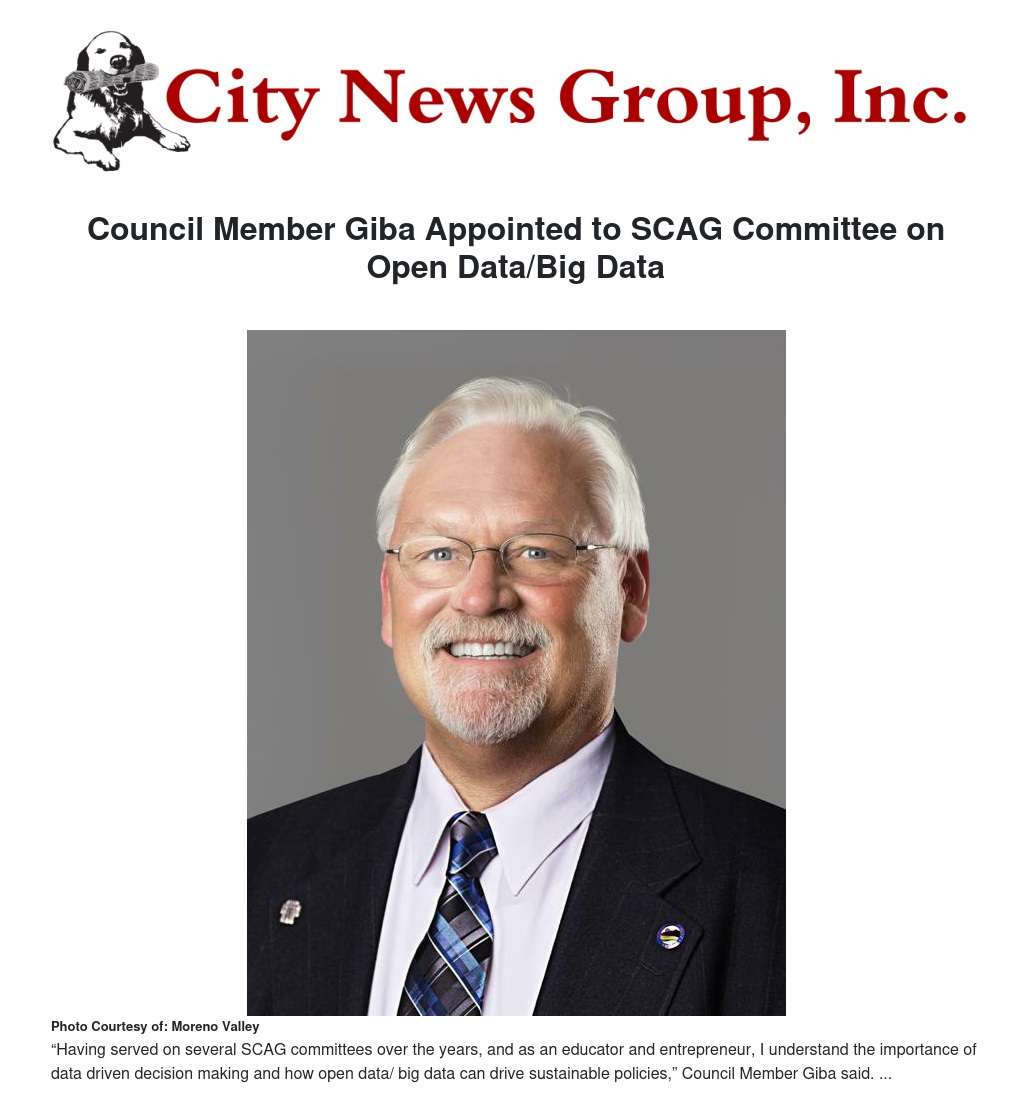 Council Member Jeffrey Giba is proud to announce his appointment to the Open Data/Big Data (ODBD) - Smart and Connected Regional Committee for the Southern California Association of Governments (SCAG).