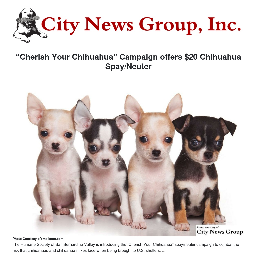 Through the “Cherish Your Chihuahua” campaign, The Humane Society of San Bernardino Valley will offer a special $20 spay/neuter surgery and free nail trim for Chihuahua and Chihuahua mixes during the month of August.