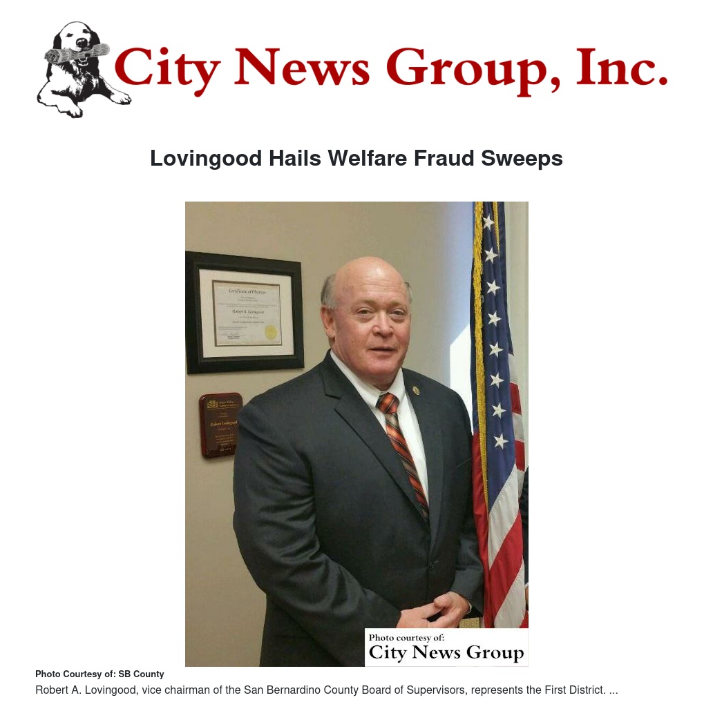 SAN BERNARDINO>> Five months after launching an initiative to increase welfare fraud referrals and criminal prosecutions, San Bernardino County Board of Supervisors Vice Chair Robert A. Lovingood welcomed a High Desert welfare fraud sweep that ended with the arrest of 10 people.