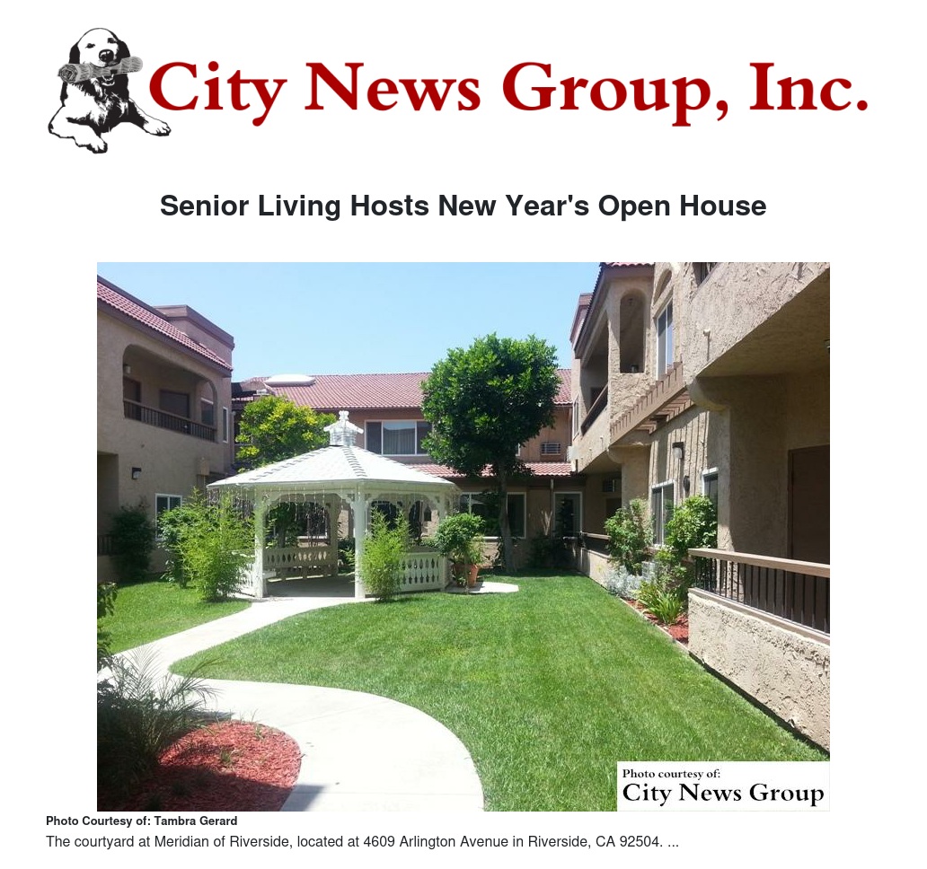 ALL>> The public is invited to attend the Meridian of Riverside Assisted Living New Year’s Open House event at Meridian of Riverside on Friday, Dec. 30 and Saturday, Dec. 31 from 10 a.m. to 2 p.m.