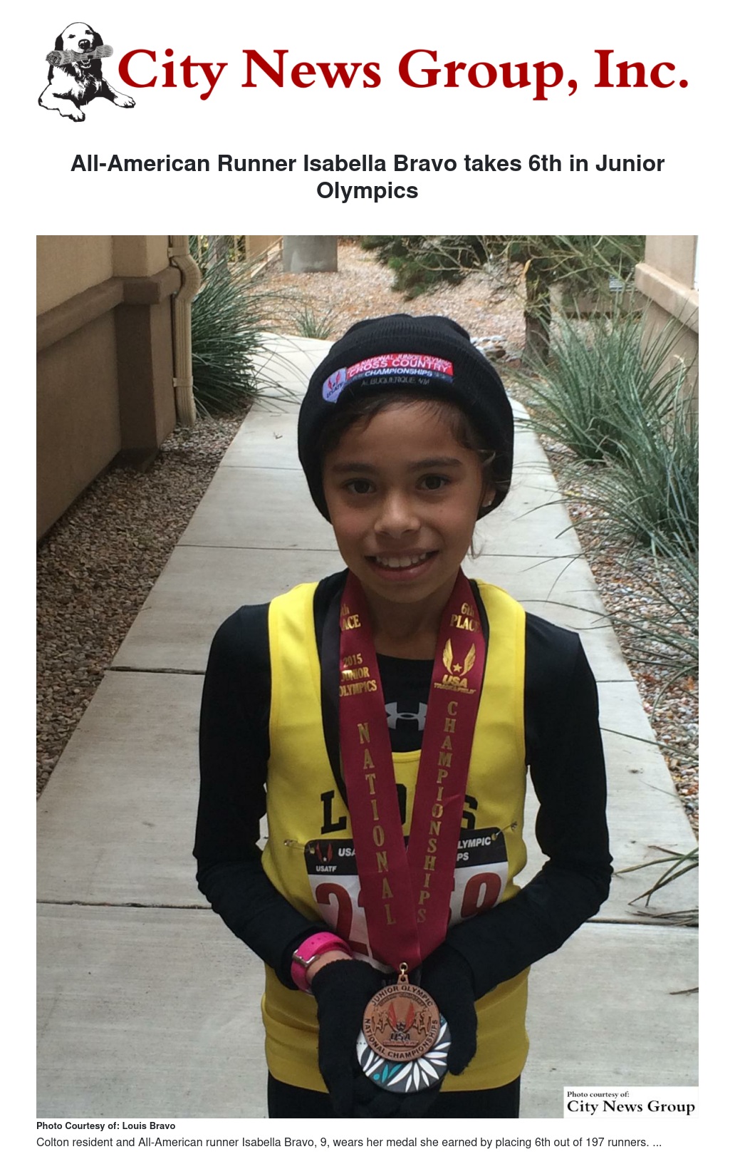 Bravo, who just turned 9 on Jan. 12, competed in the USATF National Junior Olympics (JO) Cross Country Championships on Dec. 12, 2015 in Albuquerque, NM. Eigh-years-old at the time, she competed in 1.2 miles race in the 8 & under division. Bravo certainly didn’t come home empty handed as she placed 6th out of 197 girls with a time of 8:28.87.
