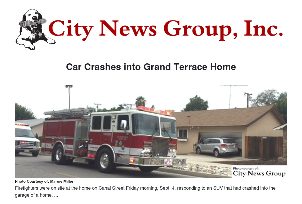Grand Terrace police, firefighters and city officials were on scene the Friday morning before the Labor Day holiday investigating how and why an SUV with one occupant crashed into the garage of a home on Canal Street, damaging the garage's steel door, stucco around the garage and impacting a vehicle inside the garage.