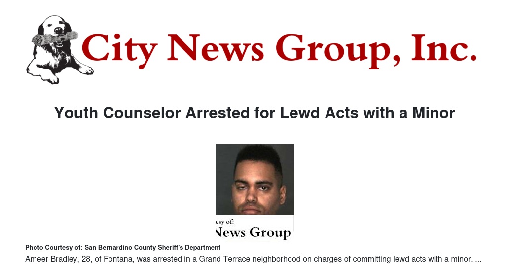 Ameer Bradley, 28, of Fontana, was taken into custody after a San Bernardino County Sheriff's deputy conducting a vehicle check on the 22700 block of De Berry Street, where he observed Bradley performing "unlawful sex acts" with a 15-year-old minor, according to sheriff's officials.