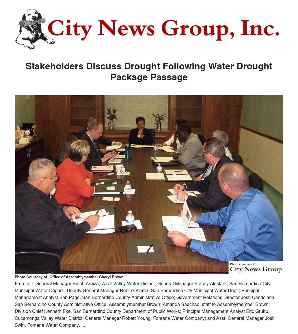 The meeting, attended by county administrative and district leaders from San Bernardino Water Department, Fontana Water Company, West Valley Water District, Colton Public Utilities, San Bernardino Valley Municipal Water District,and San Bernardino County Public Works, also discussed water storage, groundwater replenishment, water efficiency campaigns, water quality for fish and wildlife and the Bay Delta Conservation Plan.