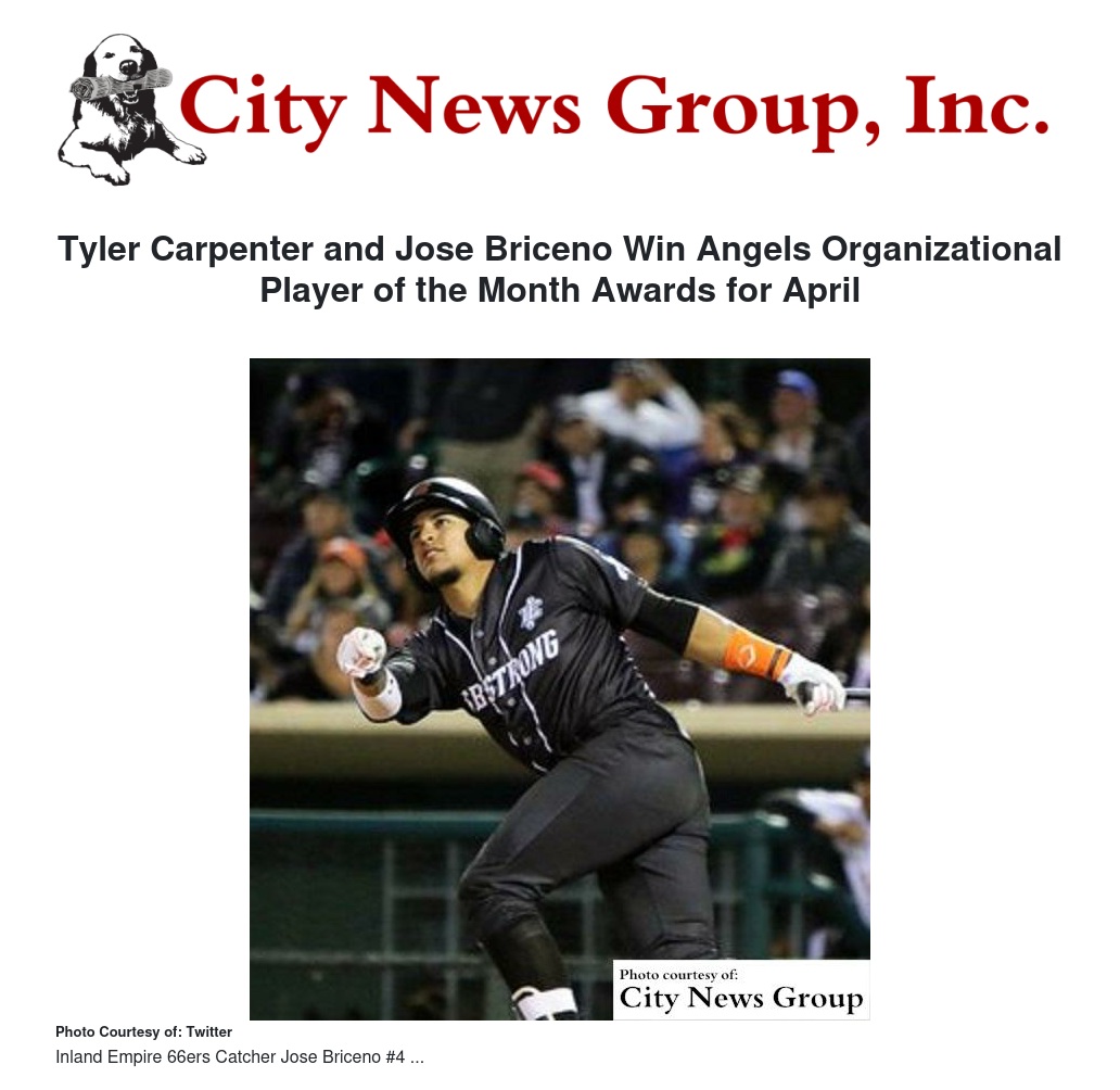 SAN BERNARDINO >> The Los Angeles Angels announced on Monday that Inland Empire 66ers Starting Pitcher Tyler Carpenter and Catcher Jose Briceno were named top pitcher and top defensive player in the organization for the month of April.