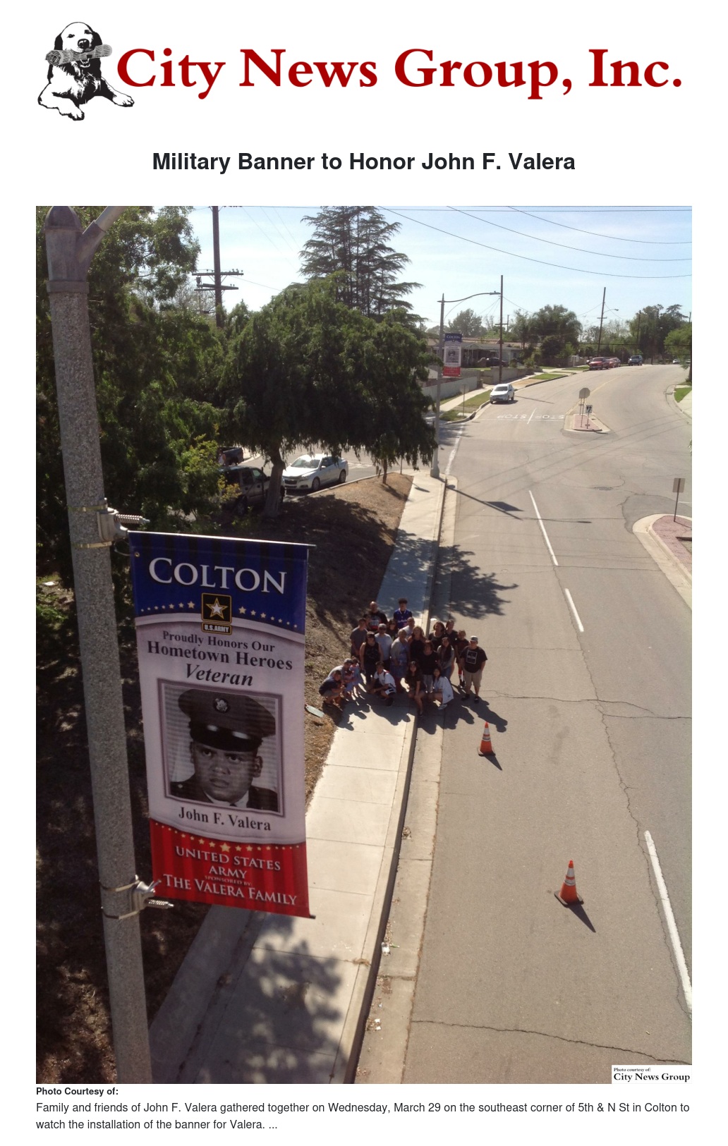 Friends and family members gathered on Wednesday, March 29 on the southeast corner of 5th & N St in Colton to watch the banner get installed.
