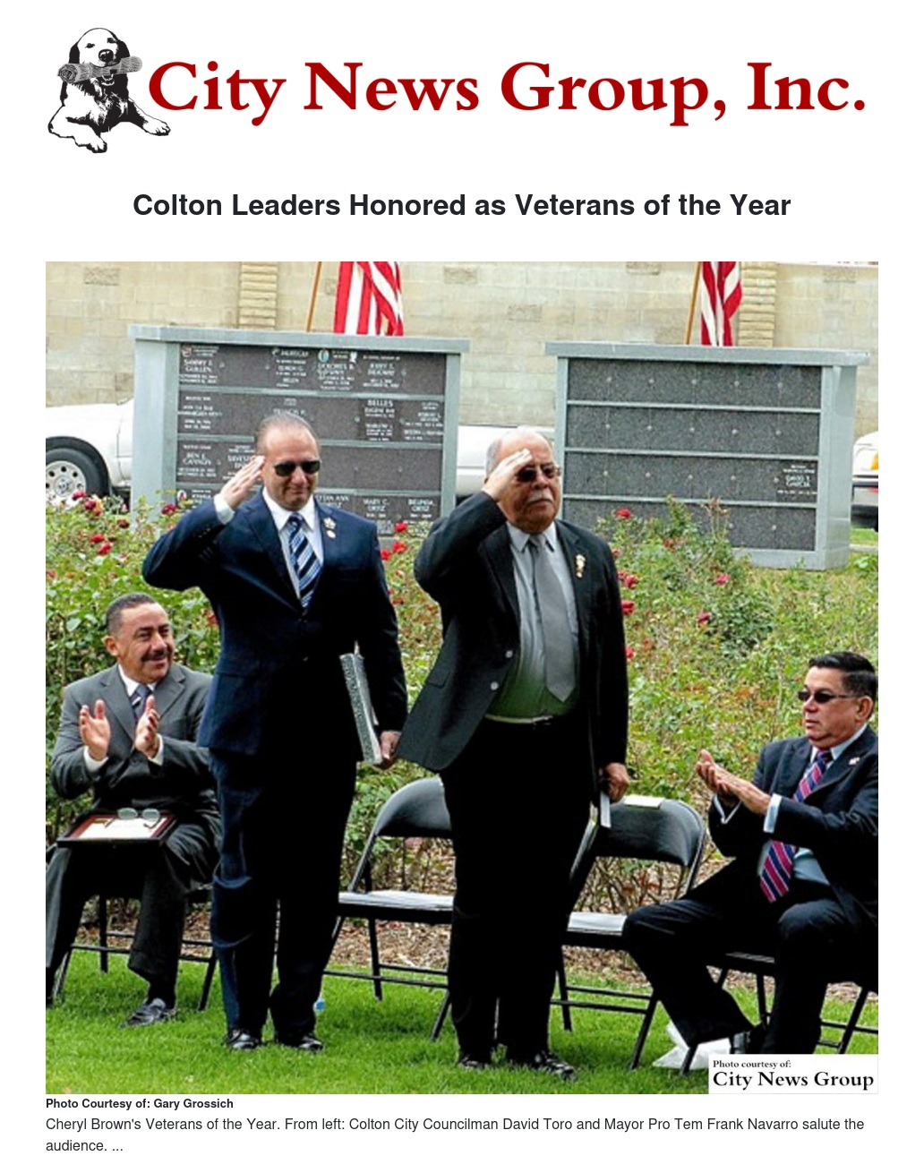 Colton’s own Mayor Pro Tem Frank Navarro and Council Member David Toro were recently chosen by Assembly Member Cheryl Brown as Veterans of the Year. Both of these decorated veterans will be flown up to Sacramento on Wednesday, June 24, to be officially honored.