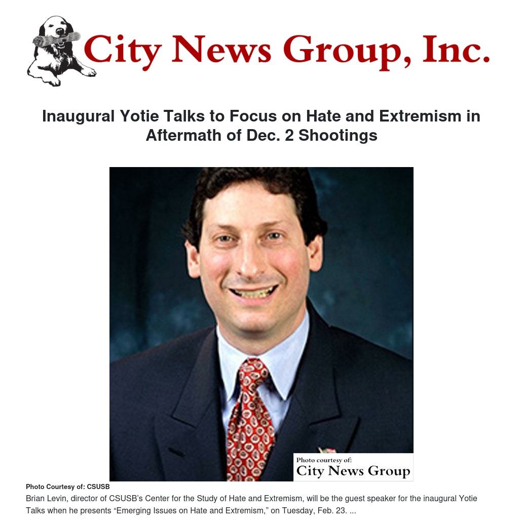 To help make sense of it, Brian Levin, director of CSUSB’s Center for the Study of Hate and Extremism, will be the guest speaker for the inaugural Yotie Talks when he presents “Emerging Issues on Hate and Extremism,” on Tuesday, Feb. 23.