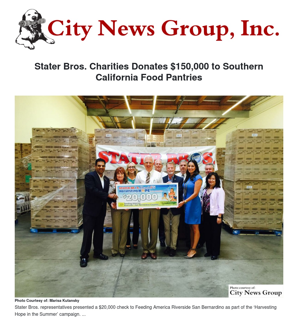 During the summer months, food pantries experience a decrease in food reserves which is why Stater Bros. Charities is donating $150,000 to help bolster reserves as part of its ongoing efforts to support the critical needs in the communities Stater Bros. Markets serves. Funds for these donations were collected at each Stater Bros. Supermarket checkstand this past holiday season during the company’s “Harvesting Hope in Our Community” campaign.