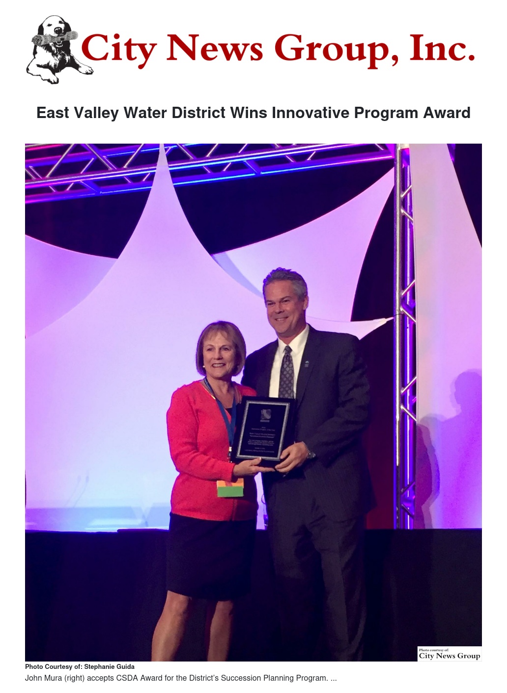 SAN BERNARDINO>> East Valley Water District was presented with the Innovative Program/Project Award for Succession Planning from the California Special Districts Association at their annual conference held Wednesday, Oct. 12.