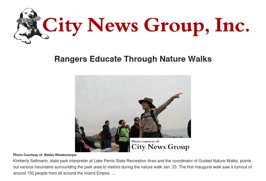“I come alive when I’m leading people out in nature on walks, so I want to share that joy and passion that I have with others,” Seltmann said. “My hope and desire is that they can see the great park of Lake Perris and enjoy it, as well.”