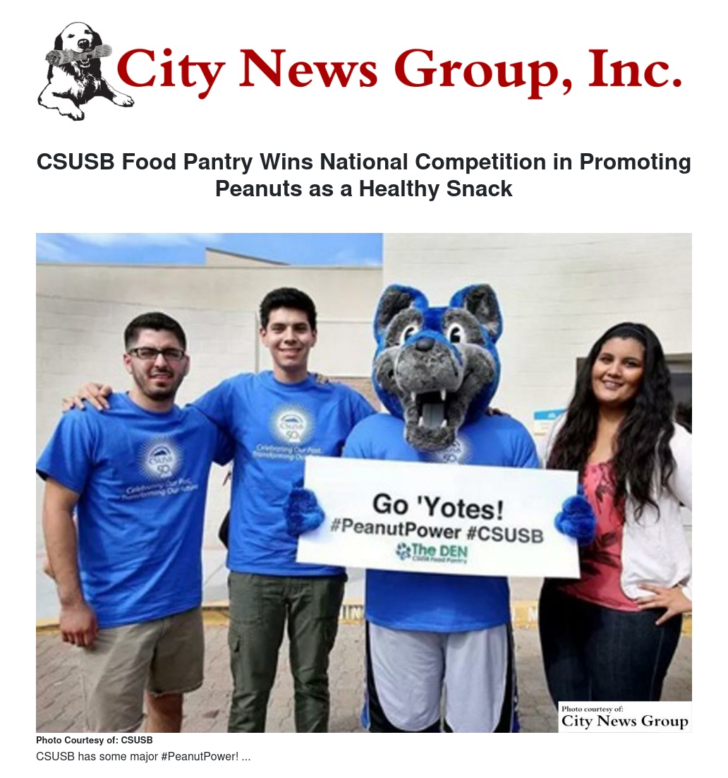 Under the #peanutpower Snack Attack Competition from the National Peanut Board, The CSUSB DEN Food Pantry bested 24 other universities with campus food pantries in sending positive messages through social media about peanuts as a healthy snack, said Dianne Podolske, director of the university’s Office of Community Engagement. For its efforts The DEN will receive a check for $2,500, she said.
