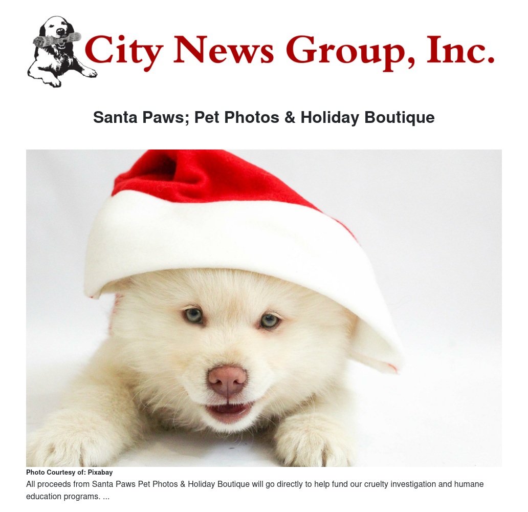 All proceeds from Santa Paws Pet Photos & Holiday Boutique will go directly to help fund our cruelty investigation and humane education programs. Thank you for helping us to care for animals in need!