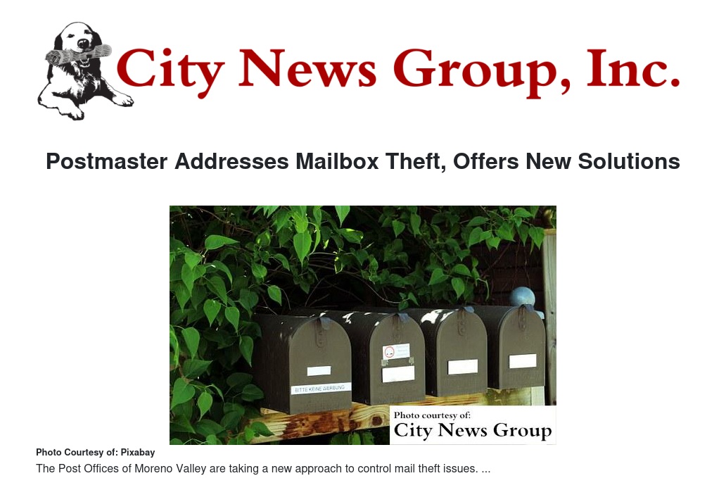 Moreno Valley>> This week, Moreno Valley's Acting Postmaster came to City Hall to discuss the continued frustration over theft of mail from cluster mailboxes and resulting damage which prevents the Post Office from delivering mail to boxes that can no longer be locked.