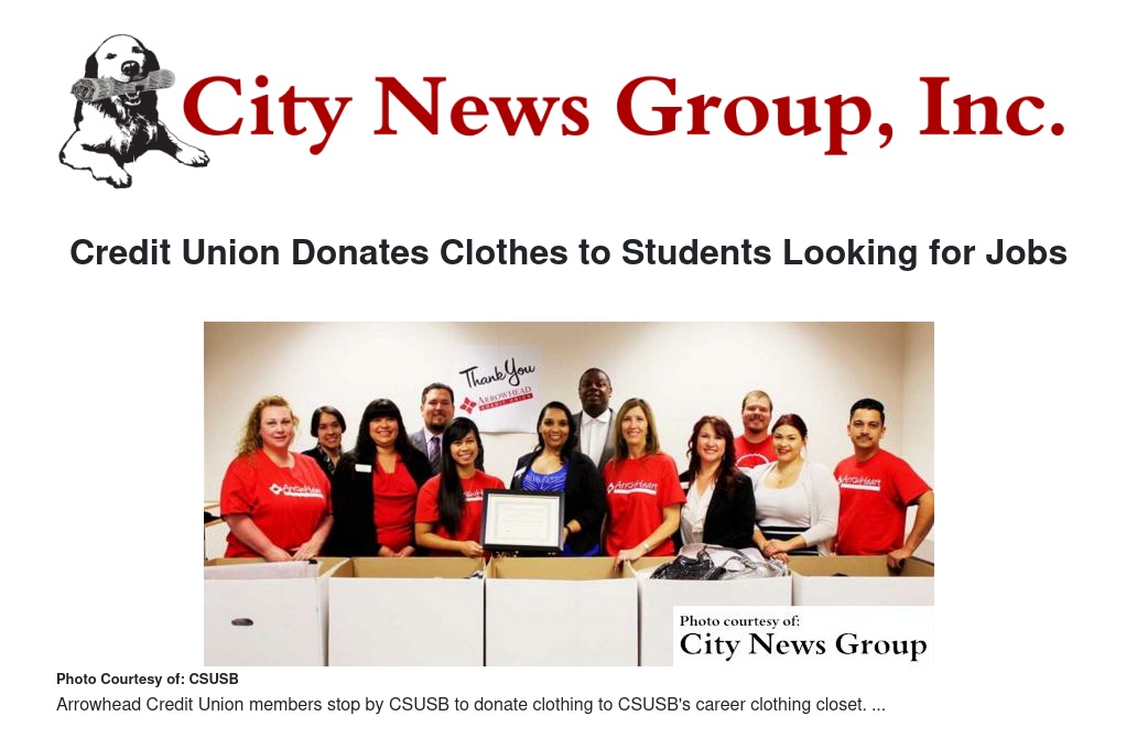 SAN BERNARDINO >> Arrowhead Credit Union team members donated and delivered more than 600 articles of clothing to Cal State San Bernardino's (CSUSB) Career Center Clothing Closet, which will help students and alums going to career fairs, job, or internship interviews and in the workplace.