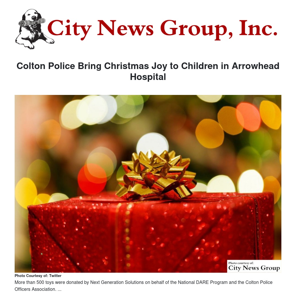 More than 500 toys were donated by Next Generation Solutions on behalf of the National DARE Program and the Colton Police Officers Association. The toys were wrapped and hand delivered by uniformed officers, Santa Claus and his elves throughout the entire hospital.
