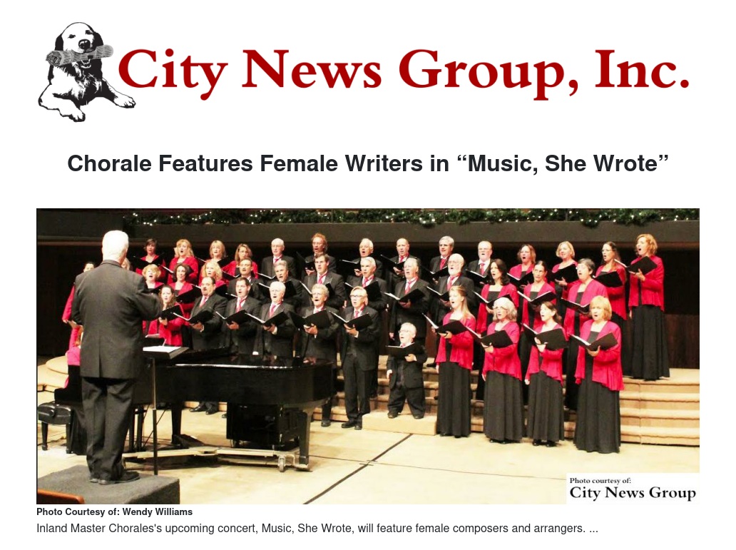 REDLANDS >> The Inland Master Chorale performs music composed or arranged by females at “Music, She Wrote” on March 5 and 6 at the First United Methodist Church, 1 East Olive Avenue in Redlands.