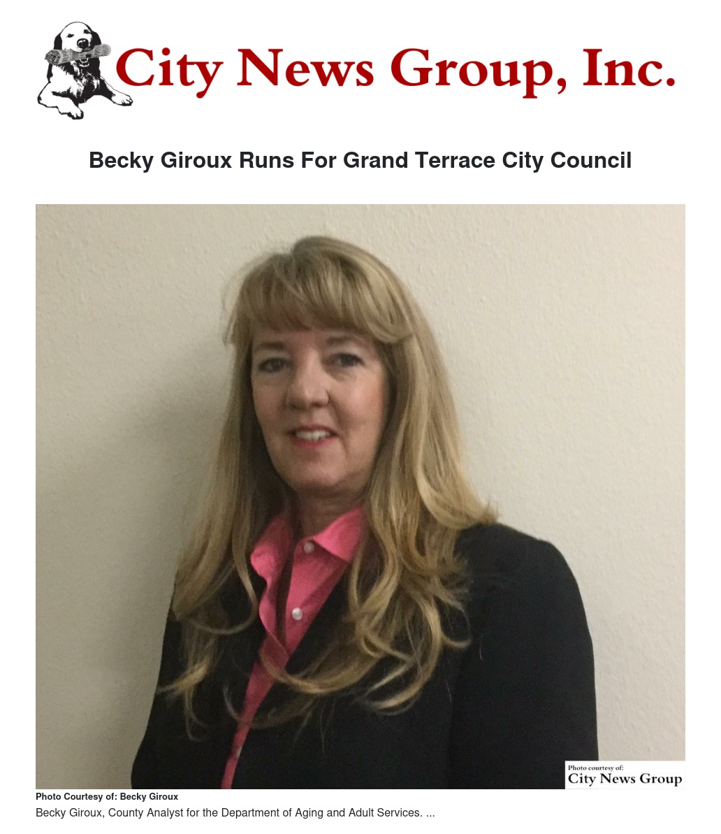 GRAND TERRACE>> Becky Giroux, County Analyst for the Department of Aging and Adult Services and a Grand Terrace resident of nearly 30 years, is running for the Grand Terrace City Council.
