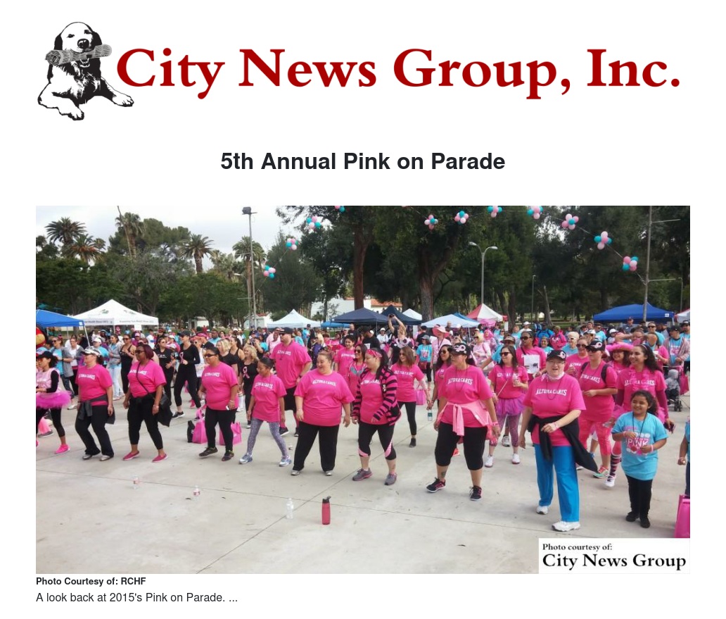 MORENO VALLEY >> Pink on Parade, Riverside’s breast cancer walk and 5K run, invites the public to be part of the fun and help fight breast cancer on Saturday, Oct. 15, 2016 at Ryan Bonaminio Park.