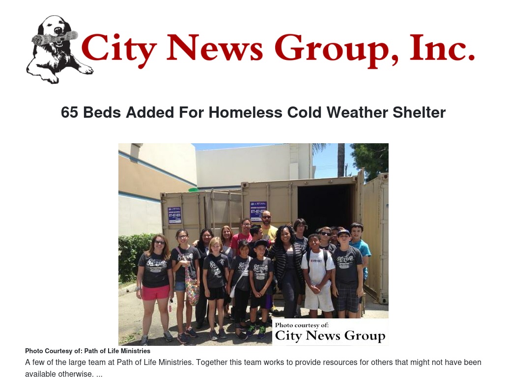 With the approach of El Niño, the County and City of Riverside have provided funding for additional beds with Path of Life Ministries Community Shelter to help those who are living in their cars or on the streets during the winter season.
