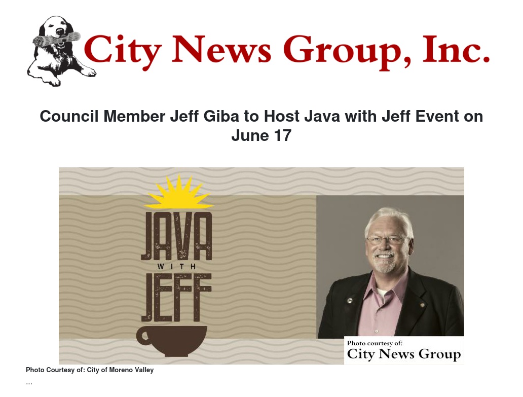 MORENO VALLEY>> Moreno Valley Council Member Jeffrey Giba, who represents District 2, will host a Java with Jeff event Saturday, June 17 to meet with residents and answer questions.