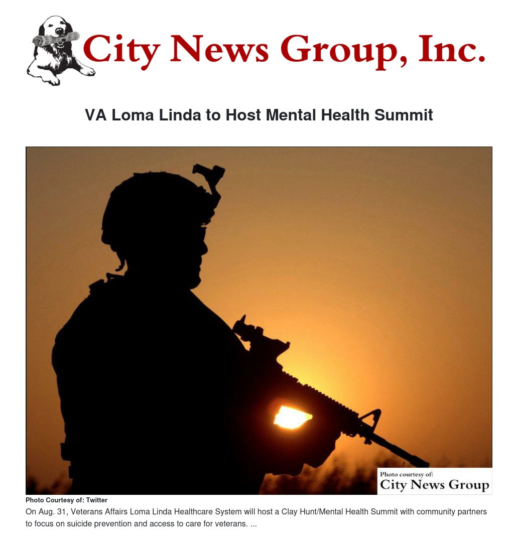 On Aug. 31, VA Loma Linda Healthcare System will host a Clay Hunt/Mental Health Summit with community partners to focus on suicide prevention and access to care for veterans. The summit will be from 8 a.m. to 4 p.m. in the VA Loma Linda Medical Center Auditorium. Community partners interested in participating in the collaborative can contact Laura Miles at 909-825-7084 ext. 1331 or Edward Armas at 909-825-7084 ext. 3956.
