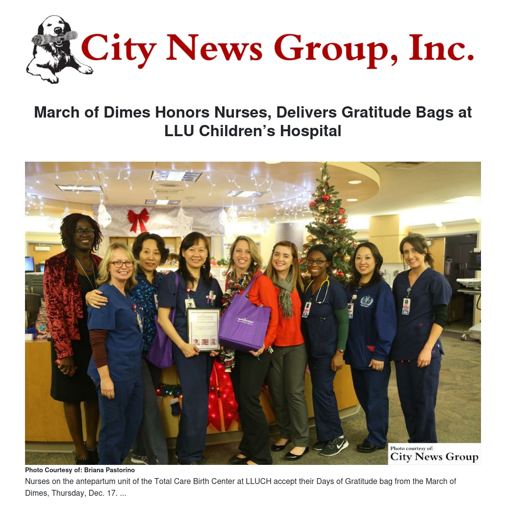 Representatives from the March of Dimes visited Loma Linda University Children’s Hospital Thursday, Dec. 17 to recognize nurses from the Total Care Birth Center and neonatal intensive care units in honor of Prematurity Awareness Month. Five units at LLUCH received Days of Gratitude bags containing patient education materials and resources for nurses as well as some holiday treats.