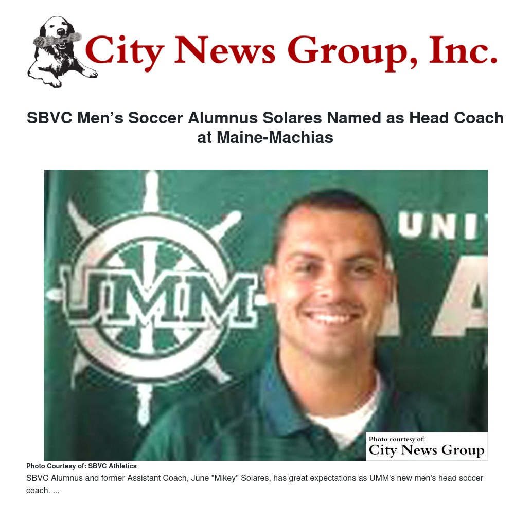 San Bernardino Valley College alumnus and former Assistant Coach Juan "Mikey" Solares, was appointed men’s soccer head coach at University of Maine at Machias starting the 2015-2016 season.
