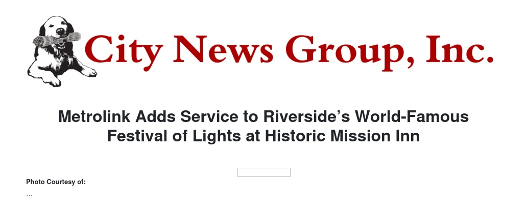 Back by popular demand, Metrolink is adding more weekend service to the Festival of Lights at the Riverside Mission Inn Hotel and Spa. Metrolink train service to the event will run November 24, 25 and December 1, 2, 8, 9,15 throughout Riverside, Los Angeles and Orange counties.