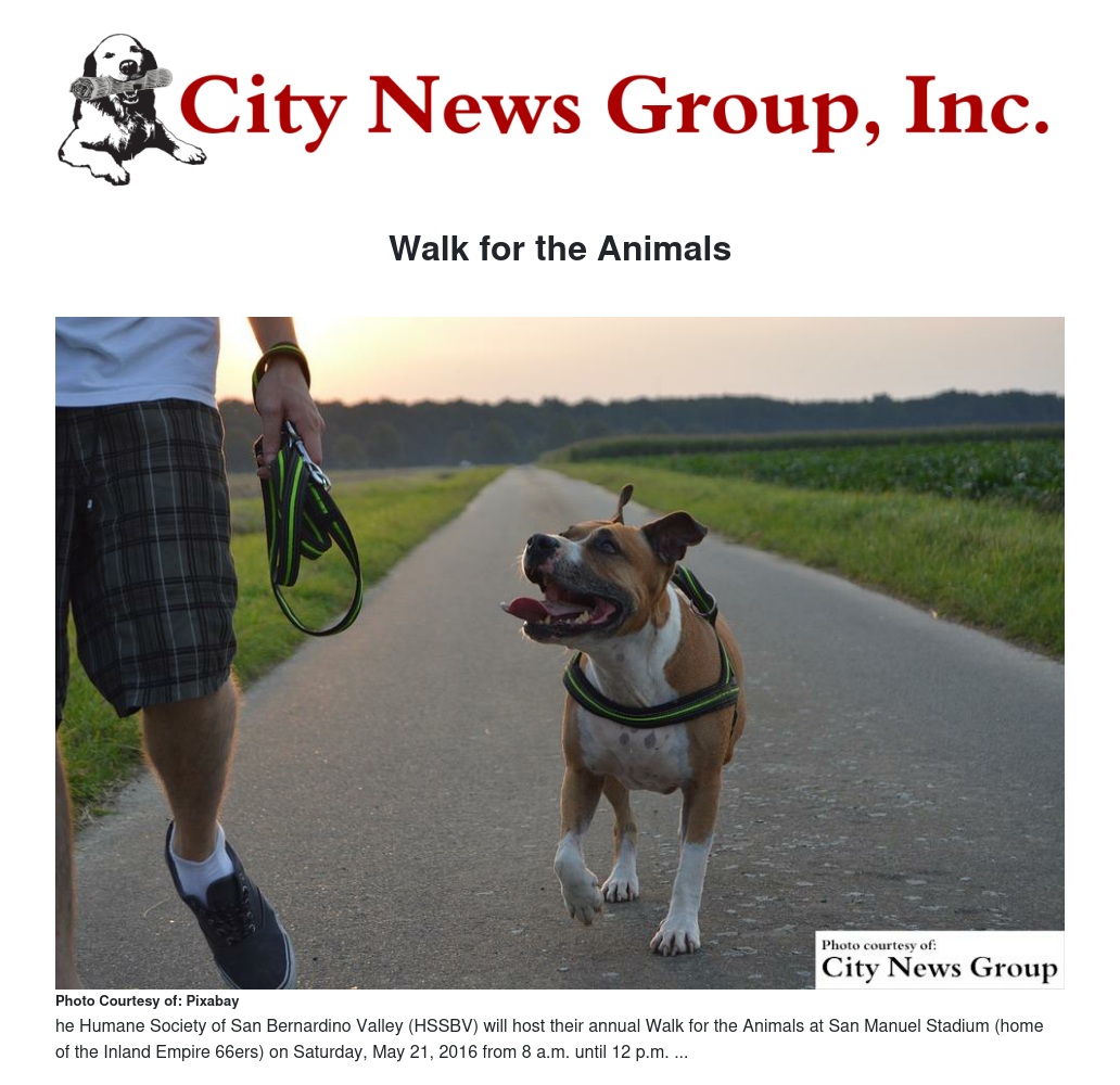 SAN BERNARDINO >> The Humane Society of San Bernardino Valley (HSSBV) will host their annual Walk for the Animals at San Manuel Stadium (home of the Inland Empire 66ers) on Saturday, May 21, 2016 from 8 a.m. until 12 p.m. Participants are encouraged to bring their leashed, trained pets to enjoy a day of fun.