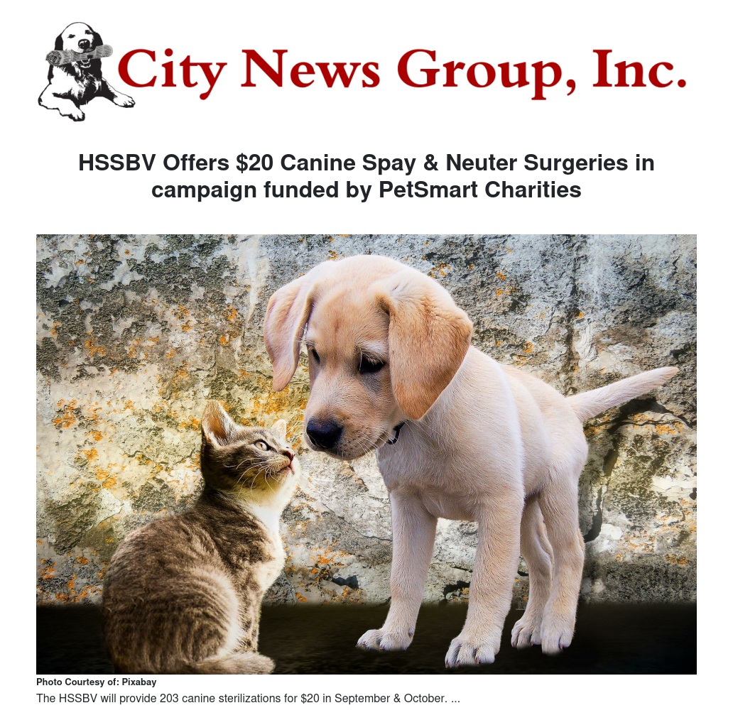The HSSBV will provide 203 canine sterilizations for $20 in September & October. Pet parents who wish to take advantage of this offer must mention the “$20 spay/neuter” campaign when they call to schedule their appointment. The campaign is based on availability, while funding lasts.