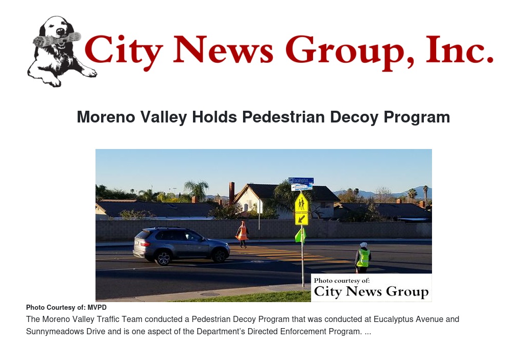 MORENO VALLEY>> The Moreno Valley Traffic Team conducted a Pedestrian Decoy Program last month after receiving numerous complaints regarding motorists not stopping for pedestrians in various crosswalks and intersections throughout the city.
