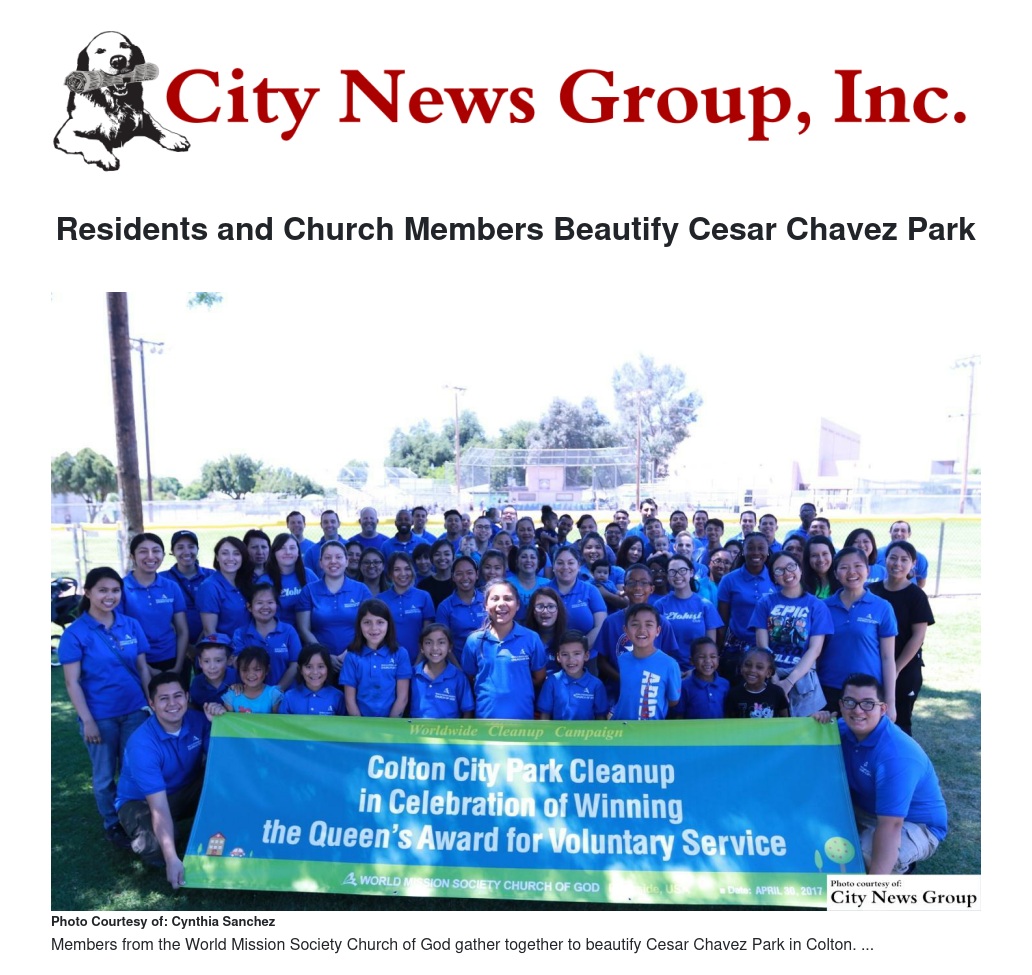 COLTON>> On Sunday, April 30, about 70 members of the World Mission Society Church of God worked together to beautify Cesar Chavez Park. The Park is located in the city of Colton and offers recreational facilities such as playgrounds, a picnic area, basketball courts and a swimming pool for the residents of Colton.