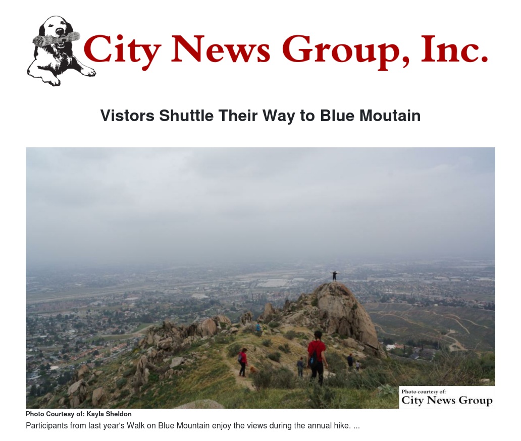 GRAND TERRACE>> The 10th anniversary of the Walk on Blue Mountain is approaching and will be held on Sunday, March 5 at 8 a.m. This the community's once-a-year chance to enjoy the best view of Grand Terrace in all directions while hiking up the 2,428 foot summit.