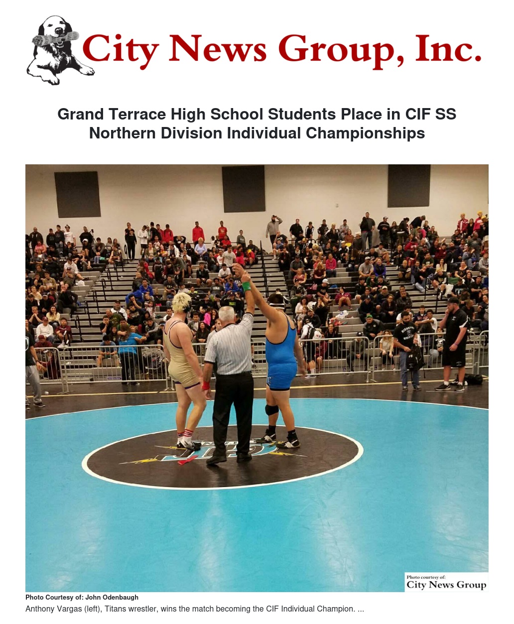Anthony Vargas, Titan’s wrestler, won the Individual CIF Champion in the Heavyweight Division, which made him Grand Terrace High School’s first Individual CIF Champion.