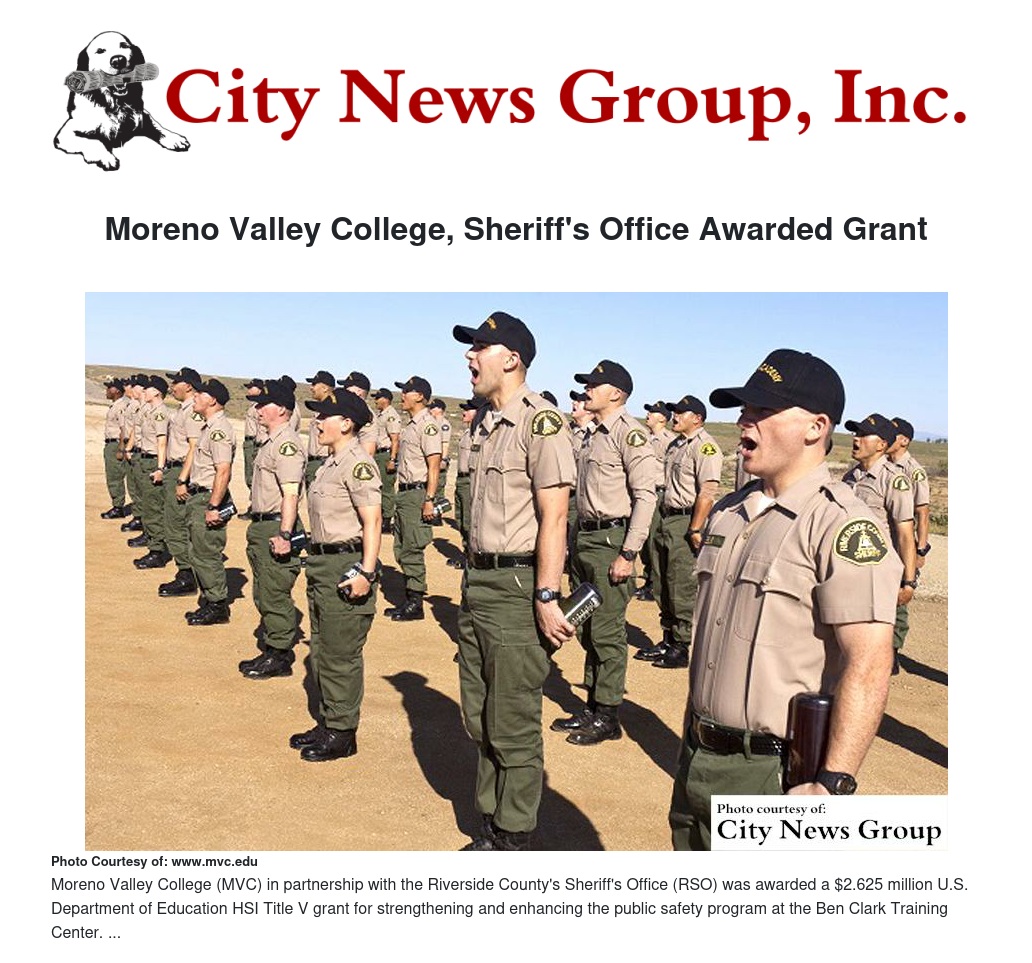 Moreno Valley College (MVC) in partnership with the Riverside County's Sheriff's Office (RSO) was awarded a $2.625 million U.S. Department of Education HSI Title V grant for strengthening and enhancing the public safety program at the Ben Clark Training Center.