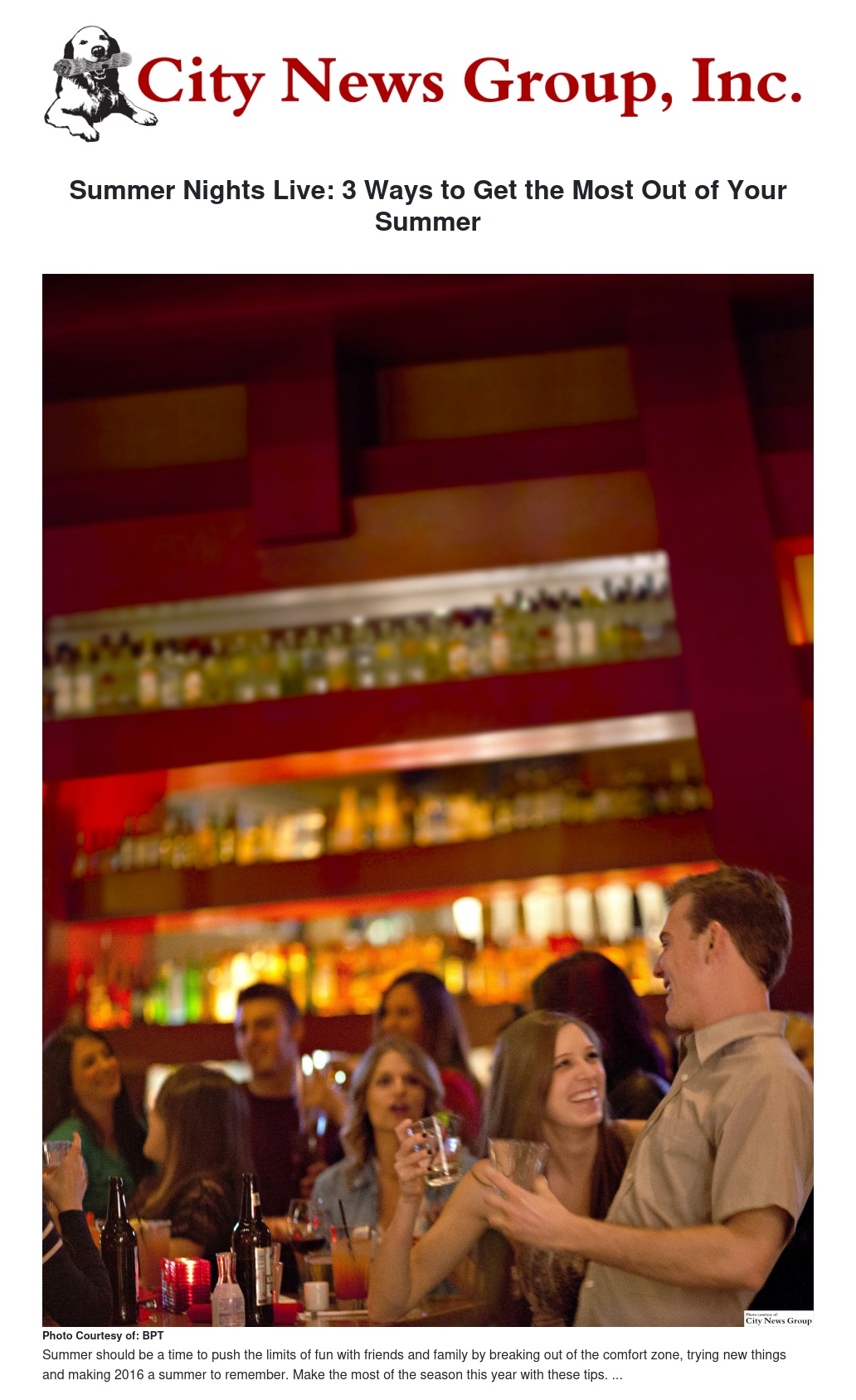 Find new places to kick back. It's patio season! As fun as it might be to kick back in the yard with the usual drinks, seize the energy of summer though new adventures in food and drink! There's no better time to gather the crew, explore fresh seasonal menus at local restaurants and discover tantalizing summer drinks and fare with friends.