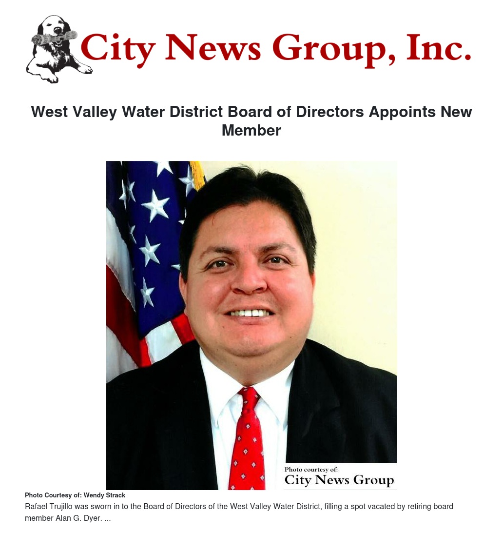 SAN BERNARDINO>> The Board of Directors of the West Valley Water District announced the appointment of Rafael Trujillo to the board, filling a spot vacated by retiring board member Alan G. Dyer.